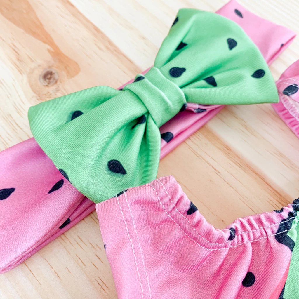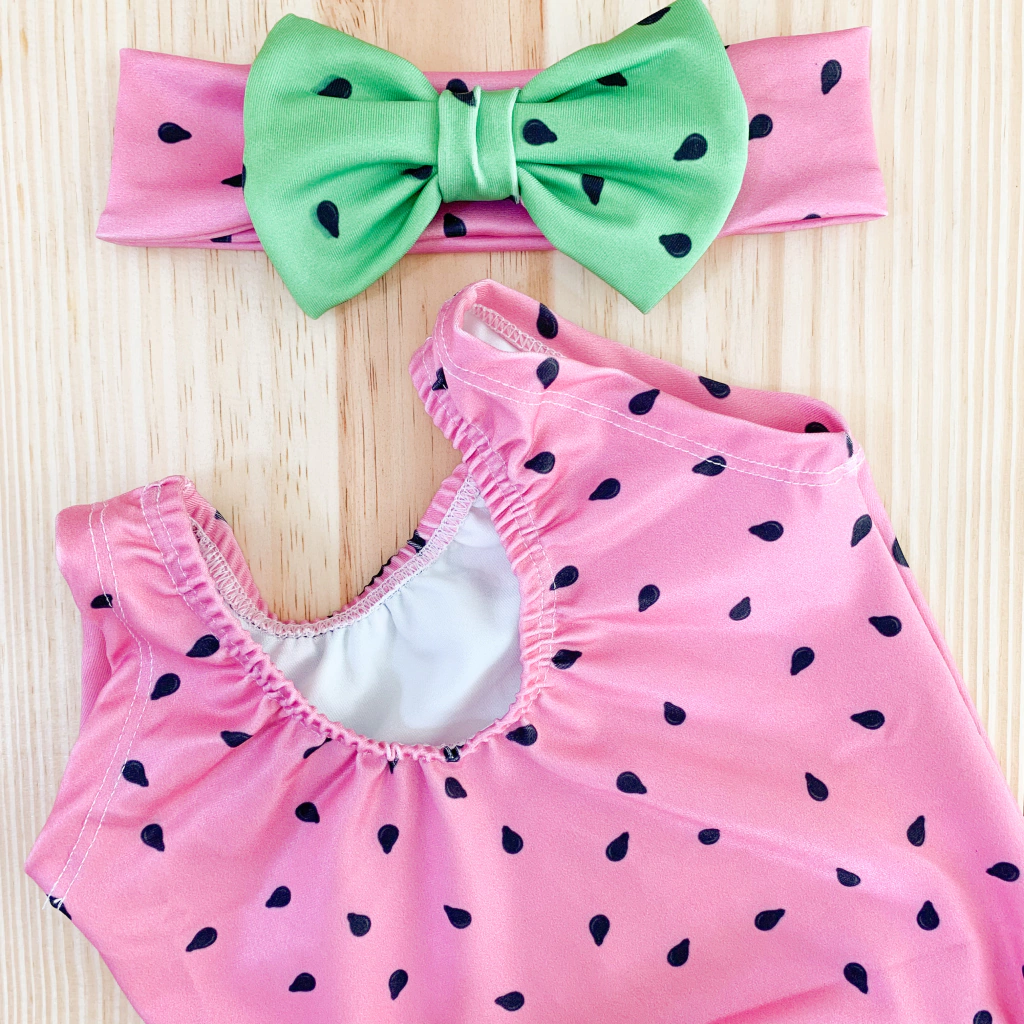 Maiô todo em poliamida com elástiquinho por todas as barrinhas. Com estampa bem delicadinha. Acompanha a faixa no mesmo tecido com laço aplicado.
