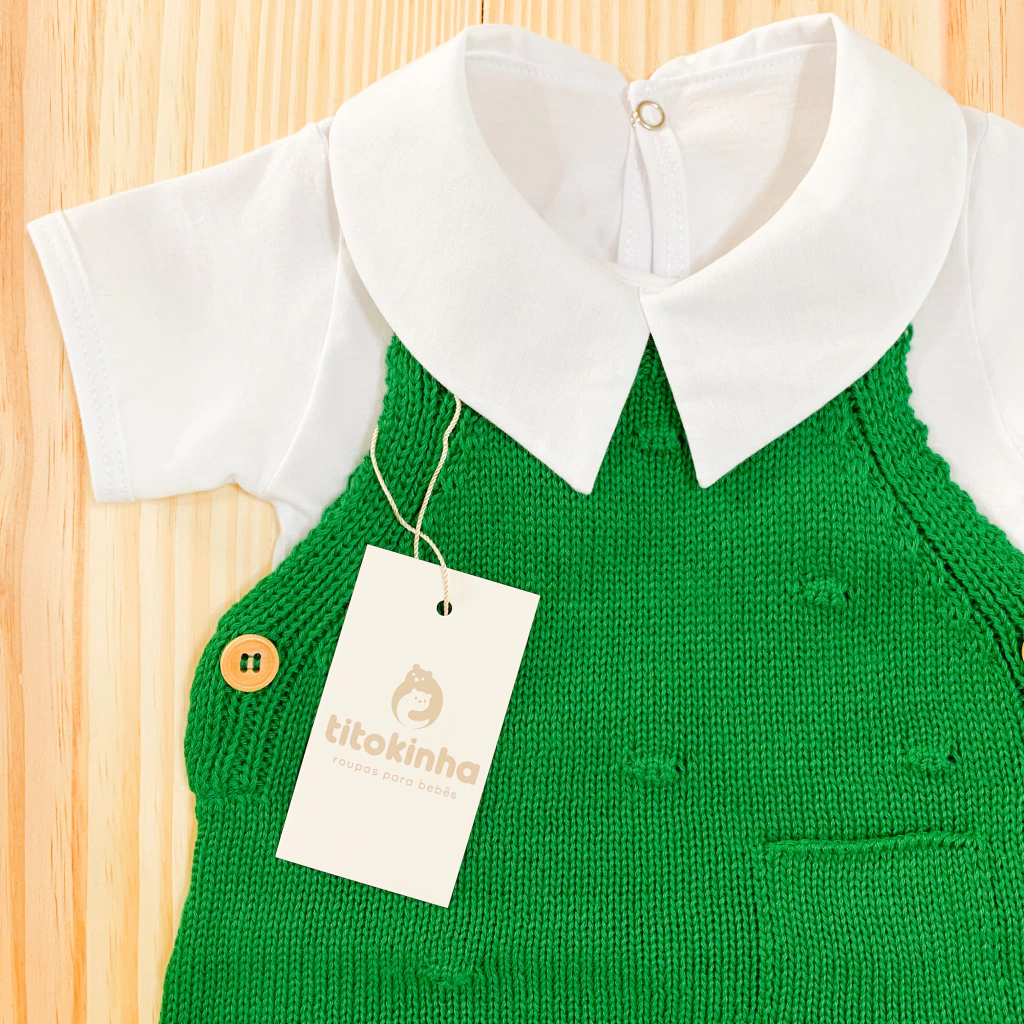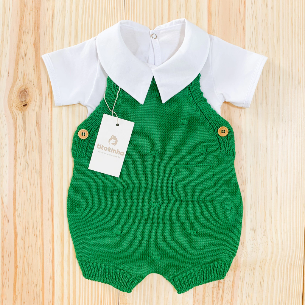 Romper jardineira todo em tricot de linha, todo leve e confortável.