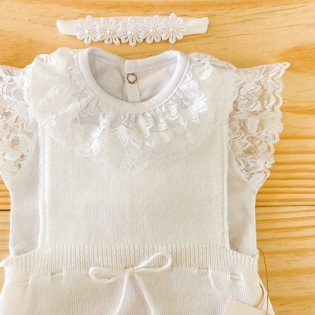 Romper Jardineira pompom branco Tricot + Body rendado + Faixinha