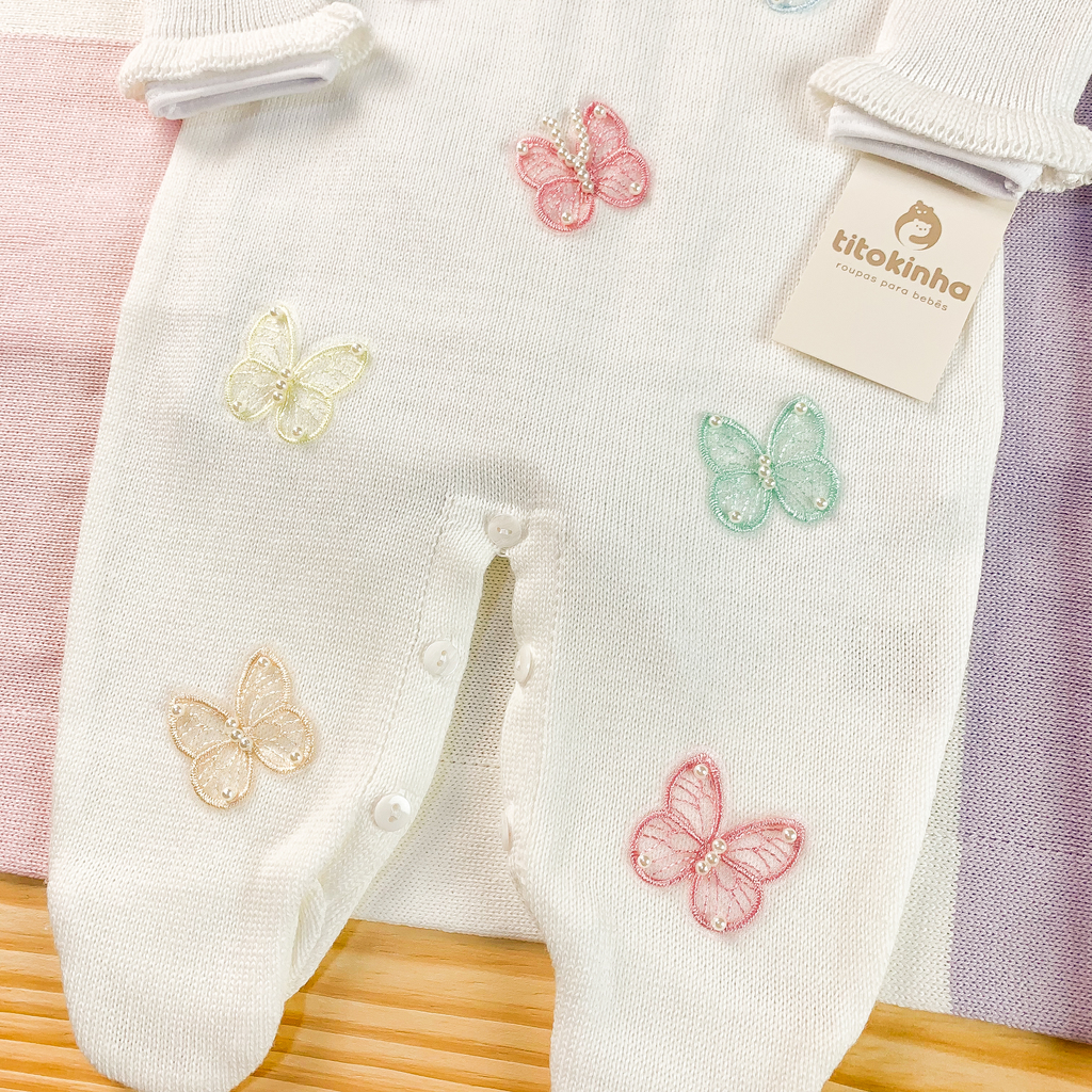 01. Macacão em tricot de linha com borboletas aplicadas, trama toda delicada e botões atrás para facilitar a troca. Pérolas aplicadas na borboletas e babadinho no punho da manga.