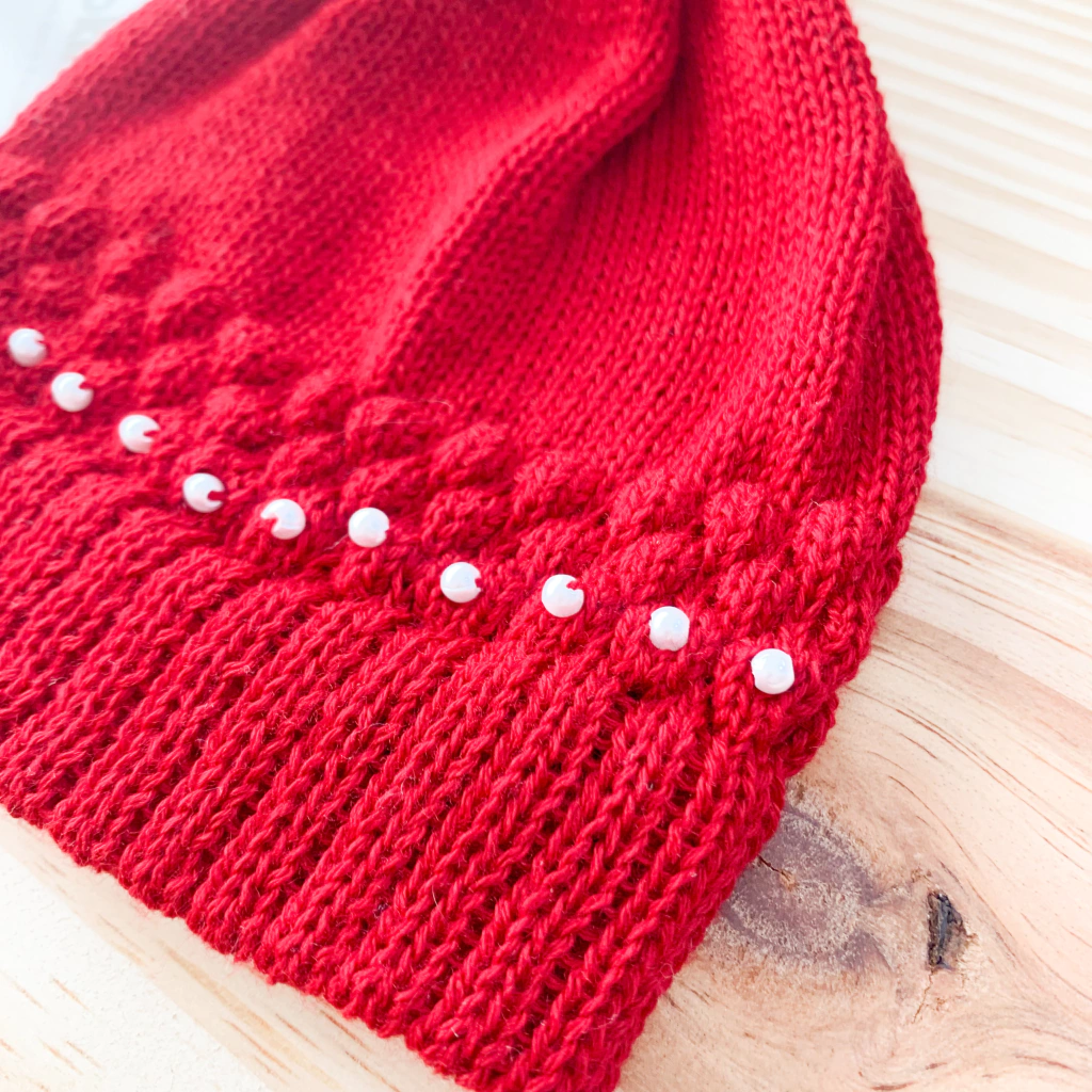 Com a trama toda delicada e pérolas aplicadas na touca e na luva.
