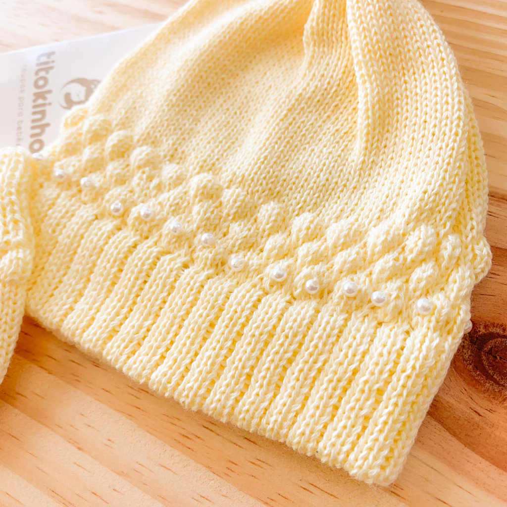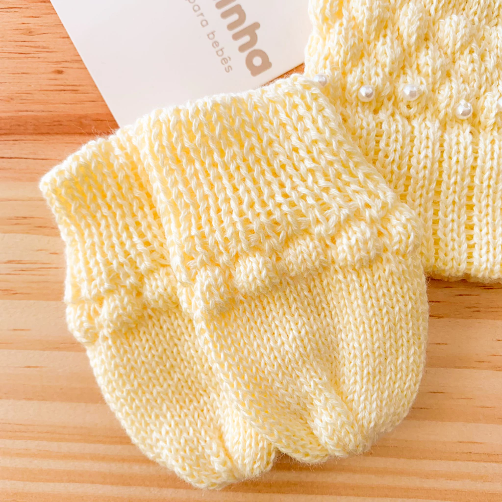 Touca e luva pompom pérolas amarela