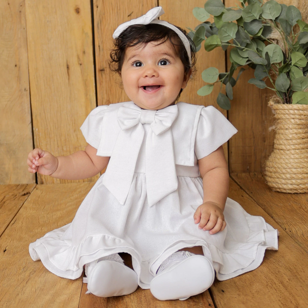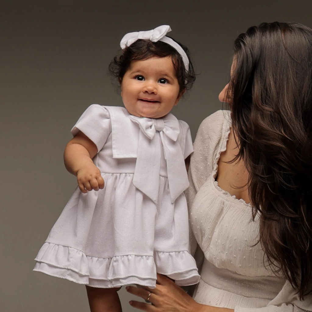 A saia, ampla e rodada, é finalizada com babado duplo na barra, criando movimento e um ar clássico que transforma cada gesto do bebê em delicadeza. A fluidez do tecido e os acabamentos impecáveis fazem deste vestido uma escolha marcante para batizado e apresentação.