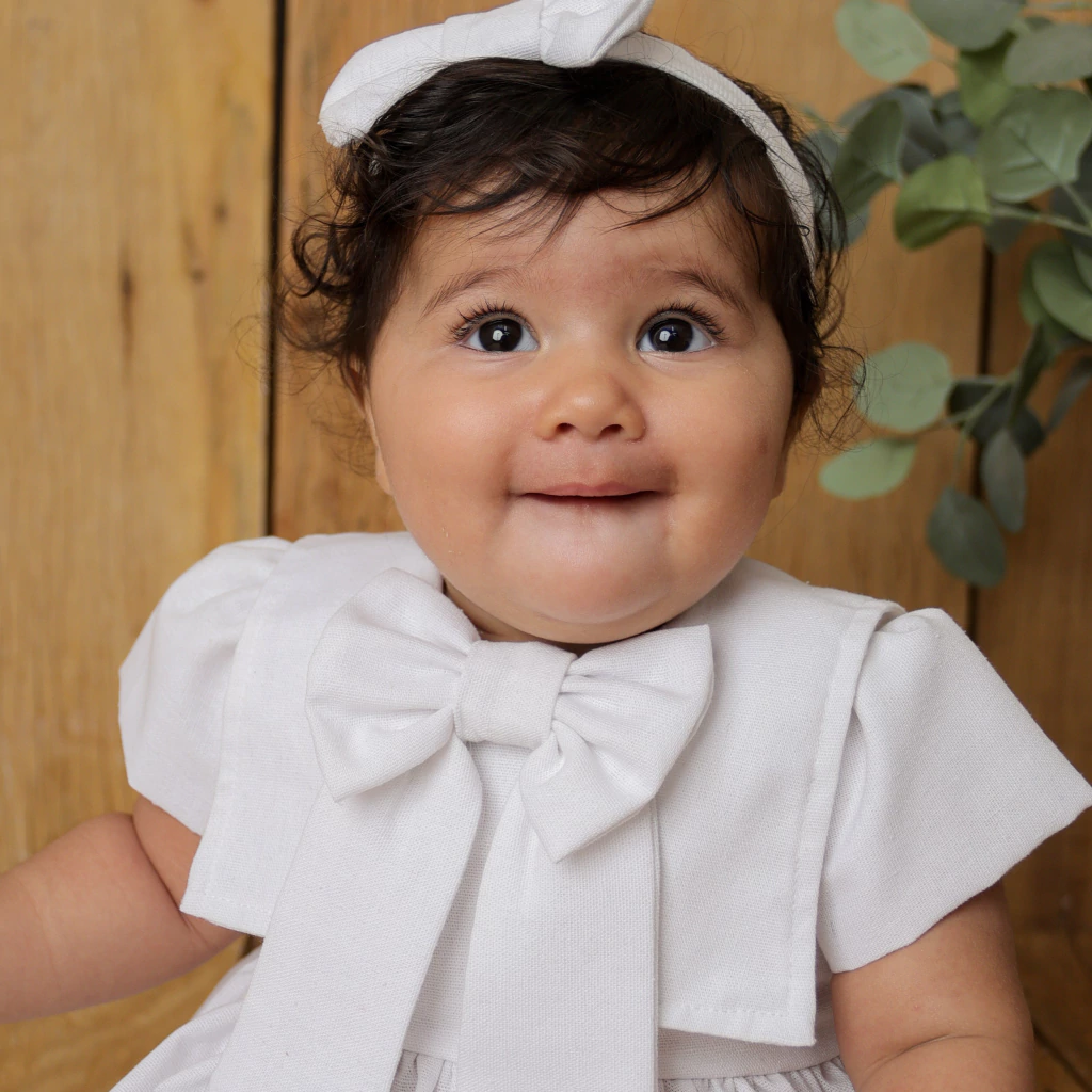 Confeccionado em linho leve, este modelo traz a sofisticação da gola quadrada longa, que contorna delicadamente os ombros e recebe ao centro um laço aplicado, símbolo de pureza e afeto. As mangas bufantes acrescentam volume e charme, equilibrando o design com um toque atemporal. O fechamento por botões nas costas garante praticidade na hora de vestir.