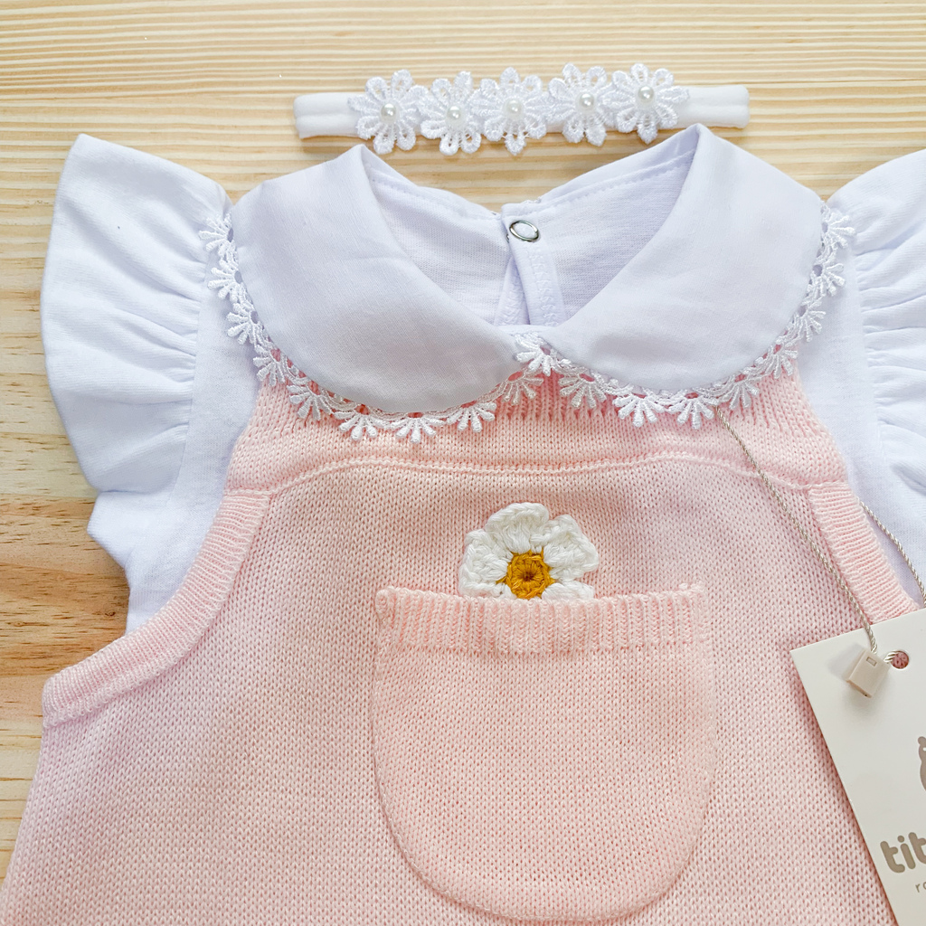 Um combinadinho completo composto por um charmoso vestido, confeccionado em delicado tricot de linha, perfeito para os dias de passeio. Apresenta um adorável bolsinho frontal, ideal para guardar histórias marcantes. O destaque fica por conta da delicada margarida bordada, que adiciona um toque de doçura e leveza ao visual. As alças contam com botões meia pérolas para regulagem, permitindo um ajuste confortável e acompanhando o crescimento da sua pequena. O tricot de linha proporciona um toque suave e um caimento elegante.