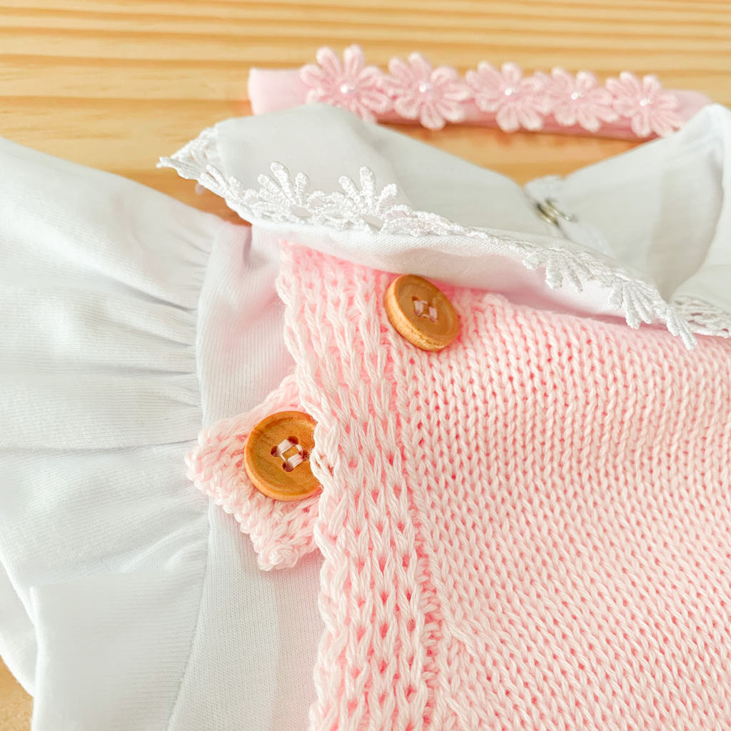 Um combinadinho encantador para sua bebê. O destaque é o vestido de tricô de linha, ideal para ocasiões especiais, com alças reguláveis por botões de madeira que acompanham o crescimento. Um delicado bolso frontal e a barra com ondas inspiradas em nuvens adicionam charme único. O tricot flexível garante liberdade de movimento.