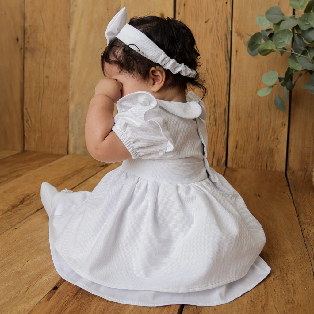 O look acompanha faixa com laço branco no mesmo tecido do vestido, criando harmonia perfeita entre todos os elementos. Uma peça que valoriza o cuidado nos detalhes e o conforto no vestir.