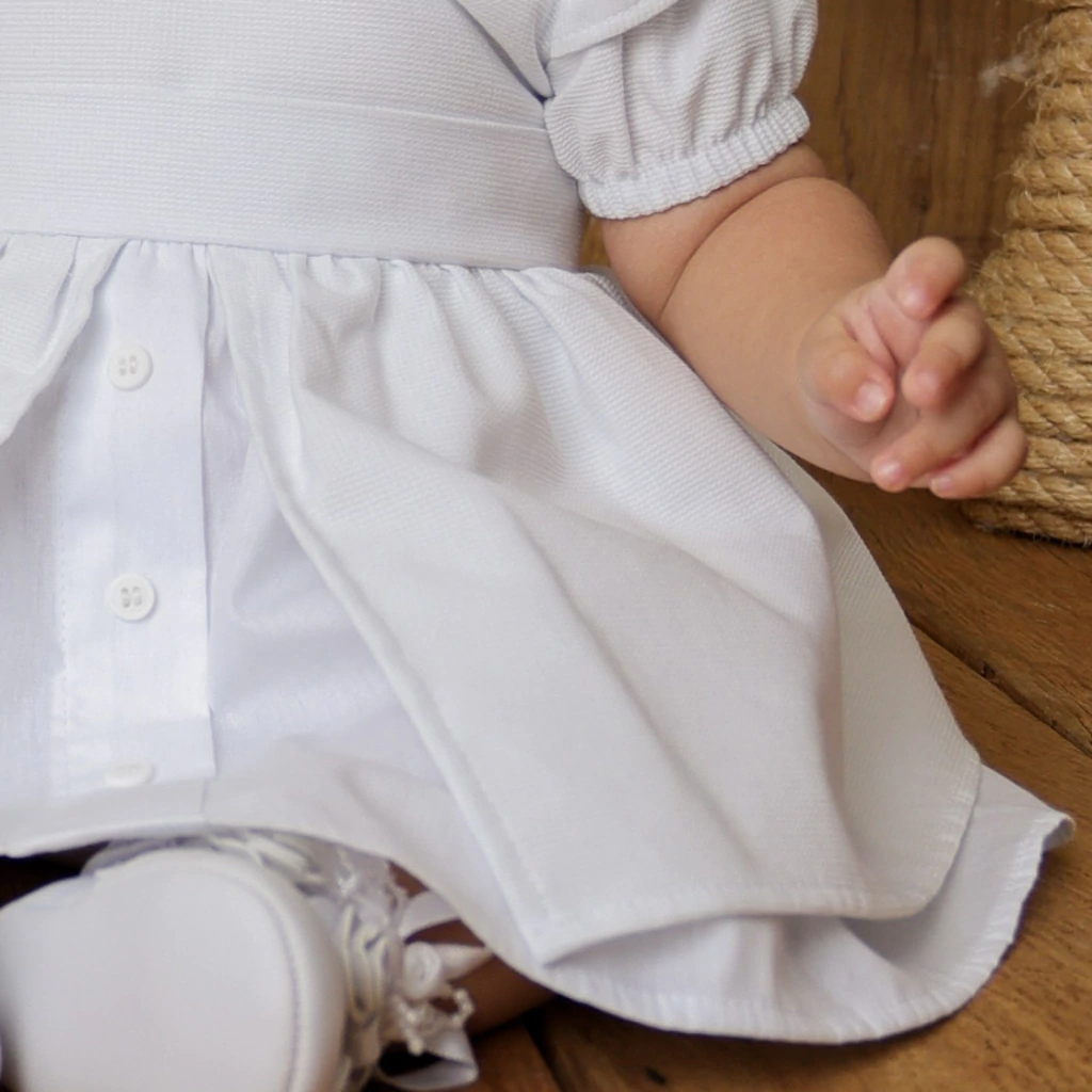 Confeccionado em fustão 100% algodão, tecido leve e extremamente confortável, este modelo une delicadeza e frescor. A gola boneca em formato de laço dá um charme especial, enquanto a cintura é marcada por uma faixa que imita um cinto, trazendo equilíbrio ao design. As mangas princesa, adornadas com babadinhos nos ombros, completam o visual clássico e atemporal.